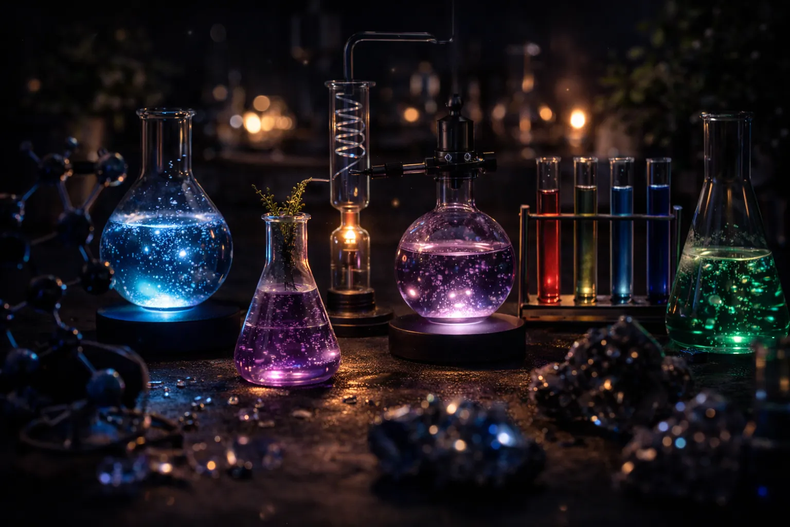 - Objets déco originaux : fioles lumineuses, modèles 3D de molécules, et même des lampes inspirées du laboratoire.